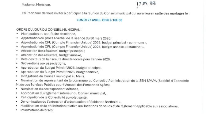 Séance publique du Conseil municipal Quand 27 avril, 2026 18h30 - 19h30 Ajouter au Calendrier Télécharger ICS Calendrier Google iCalendar Office 365 Outlook Live Affichage public CM 27.04.2026